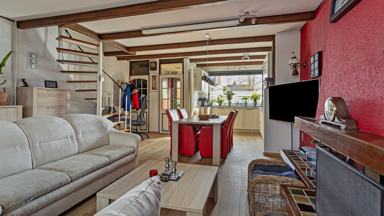 Achterin de ruimte bevindt zich de knusse woonkamer tegen de grote glazen puien. ‘s Winters kun je de open haard aansteken en genieten van gezellige avonden thuis. De houten balken op het plafond en de wenteltrap in de woonkamer voegen extra karakter toe aan de ruimte. Via de schuifdeuren kom je in de aangebouwde serre, een heerlijke plek om ‘s ochtends een kop koffie te drinken of op lange zomeravonden te vertoeven.